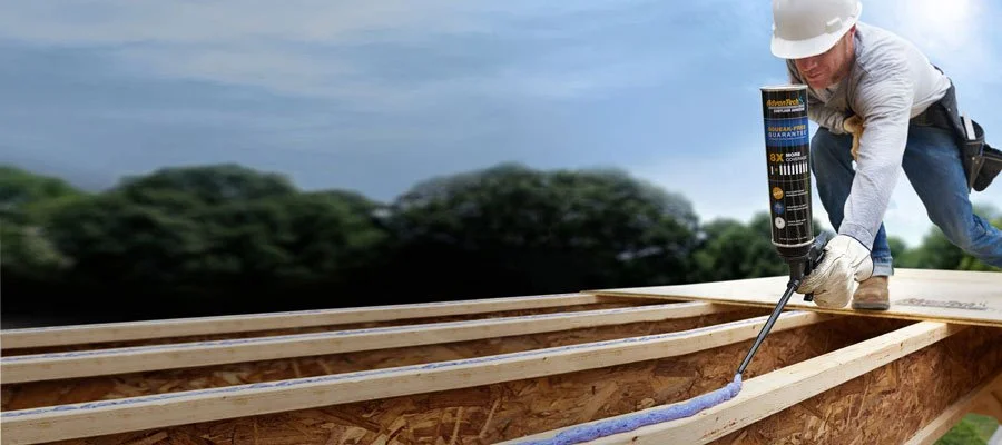 AdvanTech Subfloor Adhesive starts as a foam and cures into an extremely strong adhesive gel — creating a polyurethane bond between the subfloor panels and the joists that eliminates the movement that causes squeaks. Unlike nails and screws, the adhesive bond doesn't loosen over time.